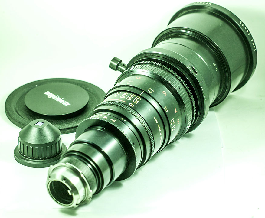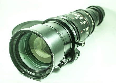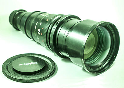 This is a long range zo0om by Angenieux in France. It is designed for 35 mm cine format (18x24 mm) and was used by Stanley Kubrick to shot a scene in his war movie: "Thin Metal Jacket". I tried this zoom on a Sony F3 HD with Super 35 format, and it worked well. The lens sometimes shifted out of focus, and came back to focus, and this is perhaps due to its age. I is a huge lens with relatively wide aperture. Back in the days, the film didn't have as much sensitivity as the CMOS sensors, and they needed larger apertures for motion picture cameras. Angeneiux still make some of the longest zoom range lenses for cinema.