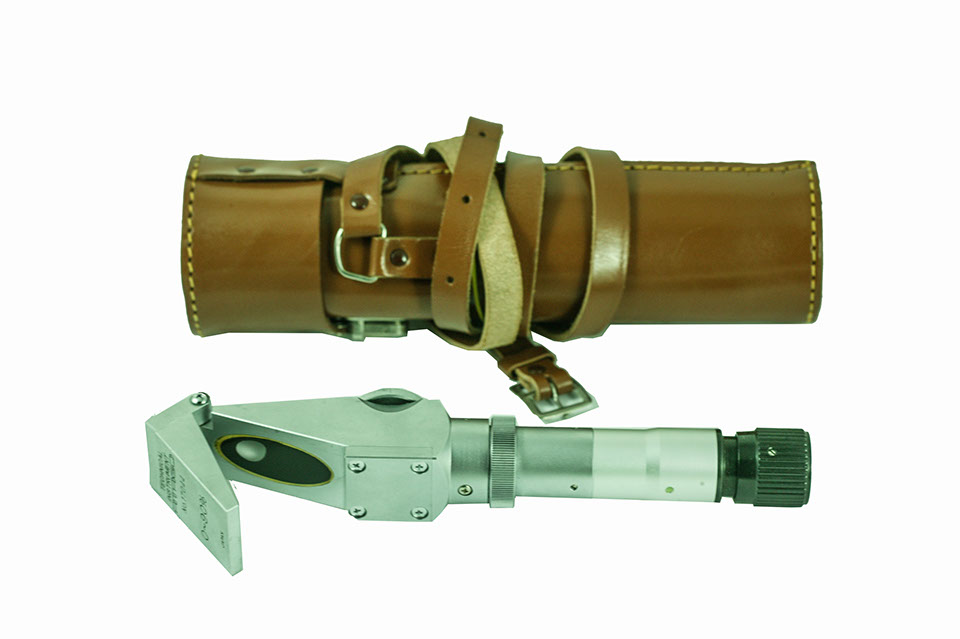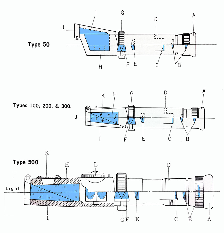 Made by Atago Optical Works, Japan, this device is to measure sugar level in solutions. The refractive index of a solution is proportional to its sugar concentration. As could be seen in below diagrams, as the light enters its optical barrel, it goes through its front prism, and through the solution applied between portions I, and H. This is very similar to an Abbe Refractometer.