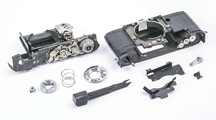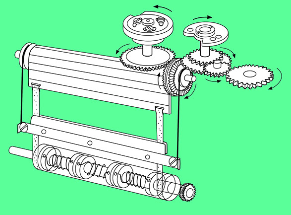 Contax IIa Shutter (left) is the only focal plane shutter in a camera that the first, and second curtain take up rollers are combined into a single but complex roller (bottom). The slit forming gears on top adjust the slit width as shown. This illustration also shows the shutter winding operation where both the first, and second curtains are wound by the charge gear on the right.