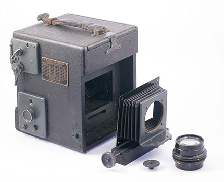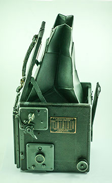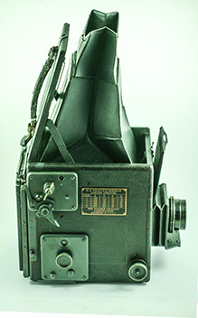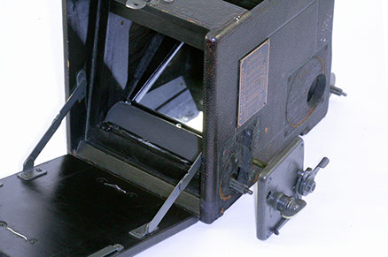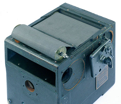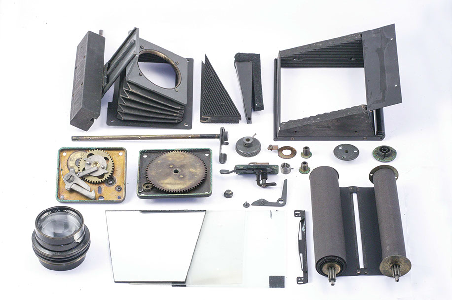 The fixed slit shutter of Graflex is shown here in a view from the back of the camera, and fully disassembled camera below. The belows mechanism, and interchangeable lenses gave this camera the versatility that victor Hasselblad grew up with, and later took it one step further in his own camera. The mirror in this camera is sequential: The shutter is released after the mirror reaches its up position. It takes 1/8 of a second for the mirror go up!