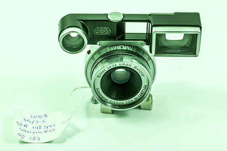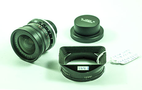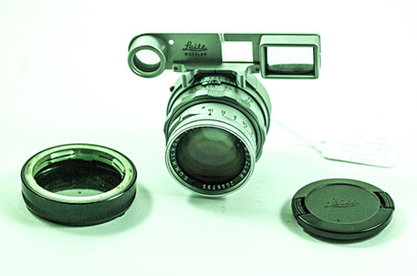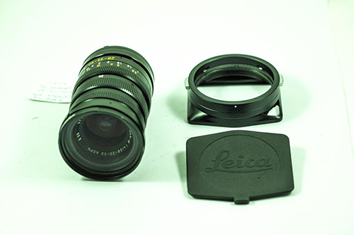 The small barrel of Leica M lenses made them packed with optics, and tightly spaced retaining rings (below). The small front lens barrel allowed snap in lens hood to be incorporated (below, right), and smaller filters. Visoflex attachement (right) added the extra distance, not allowing M lenses to be utilized.