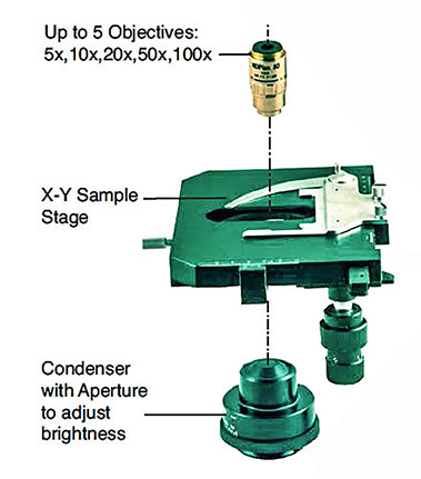 Sample stage in Olympus BH2 allows close positioning of illumination condenser from below, as well as the microscope objective from above.