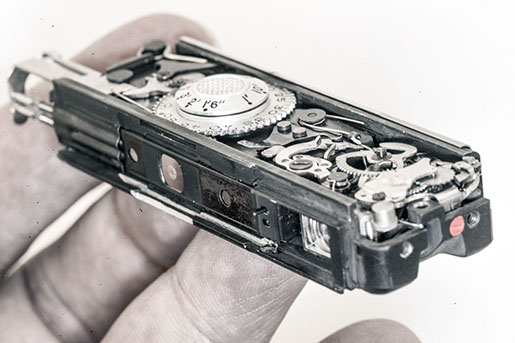 Disassembling Minox LX (left) reveals tits shutter blades and tension springs. Minox has two super thin shutter blades that run horizontally in front of the lens.