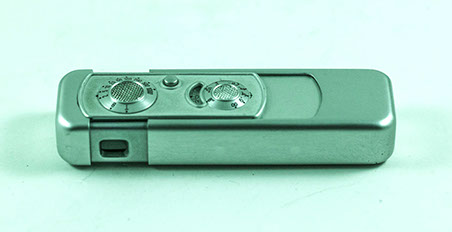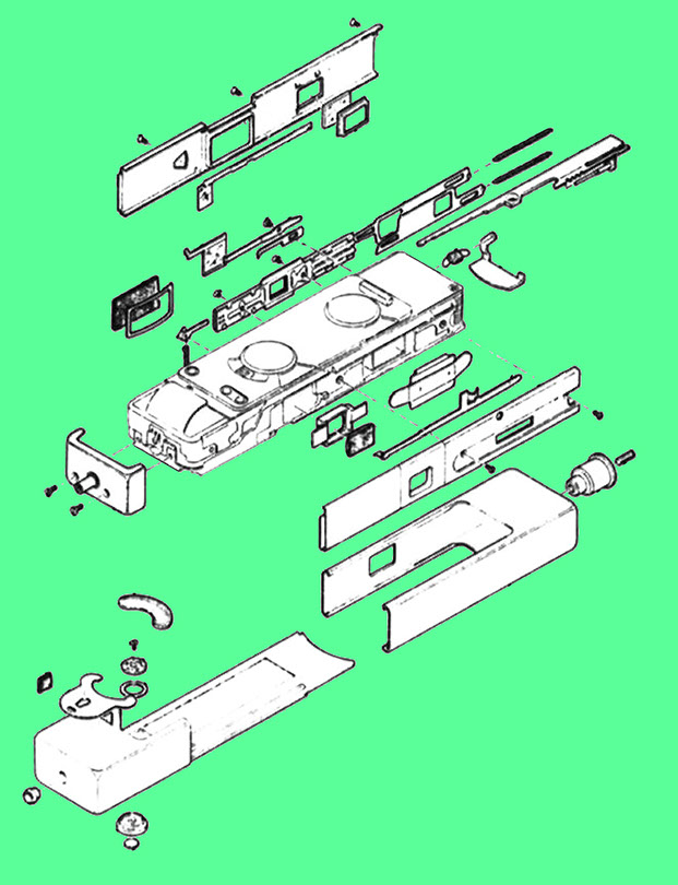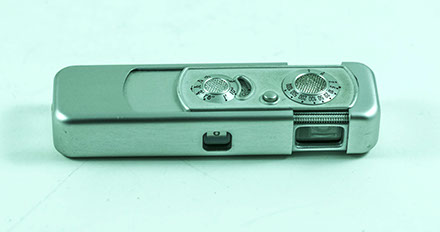 From design perspective, all the operations inside Minox, like its built-in filter slider, shutter, and film advance (via charging rack assembly, left) are arranged to operate in a linear horizontal fashion to work within its slim elongated body.