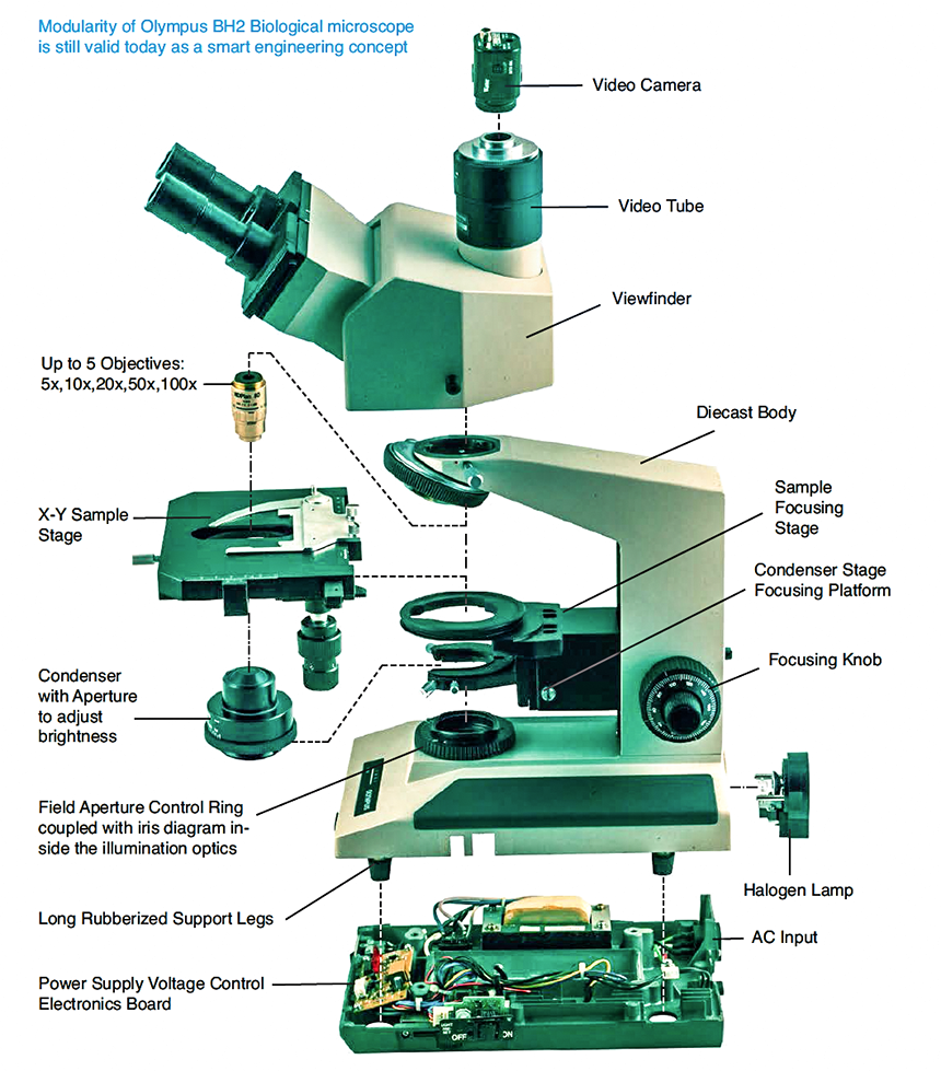 Some of the components in Olympus BX2M microscope including the superwide trinocular head (above) for OEM applications