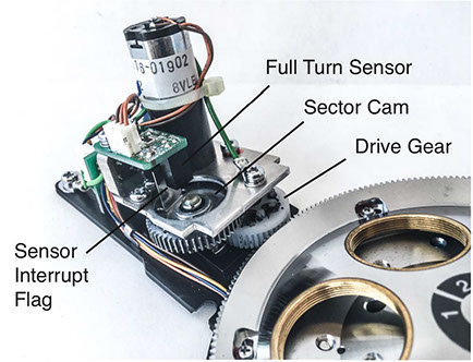 Olympus motorized nosepiece (above) uses a Geneva gear mechanism to advance the objectives via a miniature motor. The actual positioning of the turret is achieved by a mechanical detent; The mechanical play in the system allows the detent to take over after the motor stops.