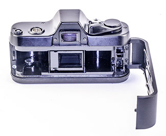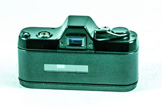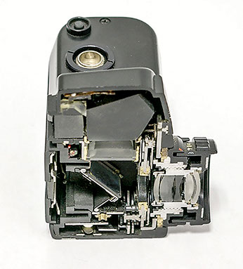 Auto 110 is cut in half (left) to reveal the inner pentaprism, mirror, and behind the lens leaf shutter. The body cover thickness in much thicker than usual because it uses plastic instead of the usual pressed sheet metal.