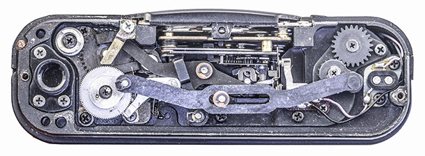 Left, Clever engineering of Pentax 110 is noticeable in this photo of the mechanism with base plate removed. The 110 film cartridge film advance gear is located on bottom left (above) while the wind lever is on upper right. The way this rotation is transferred to the charge gear is very clever: