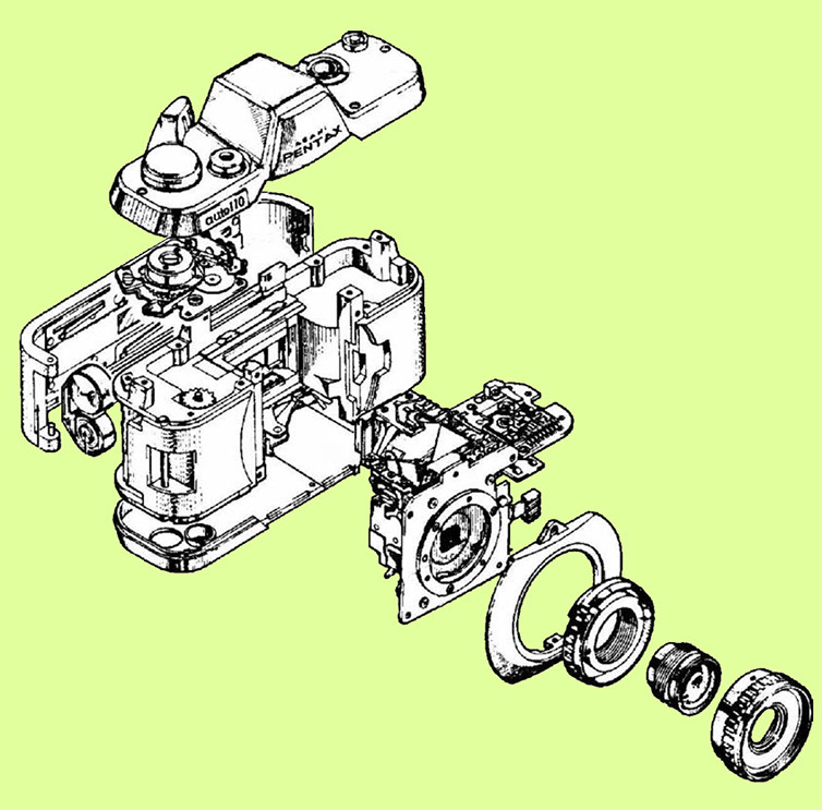 Exploded view of Pentax 110 shows the injection molded plastic housing, a very simple lens construction, behind the lens leaf shutter, and the battery compartment.