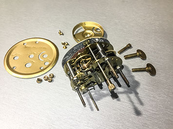 The escapement is typical of those made in desktop alarm clocks. Interesting way of attaching the knobs to end of control/winding stems, via left hand, and right hand screws, and square shaped couplings.